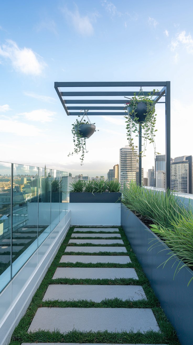 For a modern rooftop garden, pair sleek hanging planters with minimalist glass railings. This design maximizes visibility and light while keeping greenery organized. Succulents, ferns, and small flowering plants work perfectly in this contemporary setting.