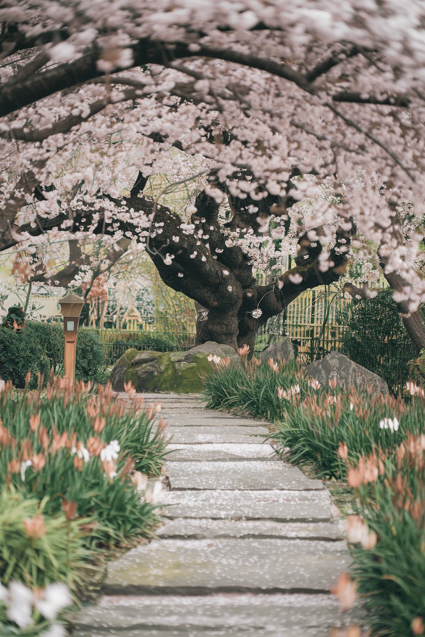 A majestic cherry blossom tree in full bloom transforms any garden into a fairy tale. Place a stone pathway beneath to enhance the whimsical scene. Plant companion flowers like violets and daffodils to complement the pink petals.