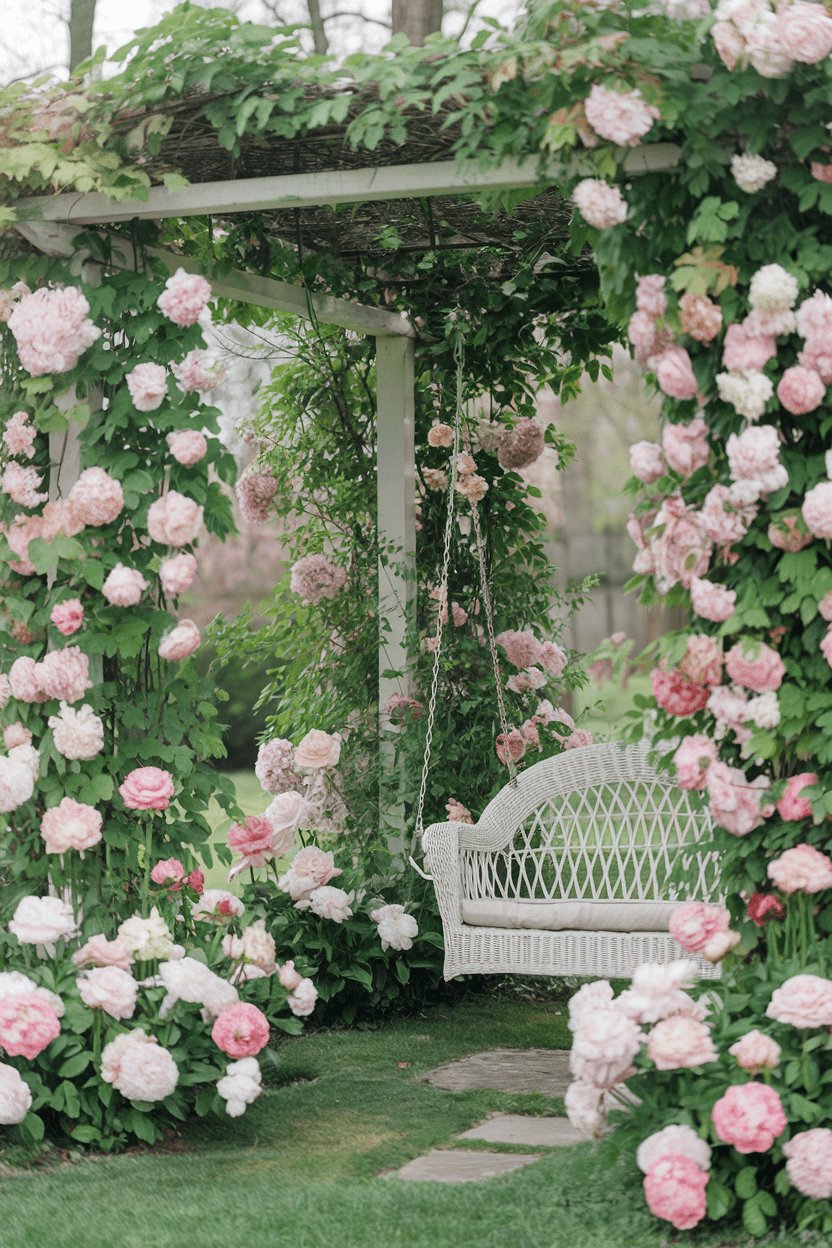 A white wicker swing under a vine-covered pergola surrounded by pastel peonies and hydrangeas is the definition of romance. Ensure vines have sturdy support as they grow.