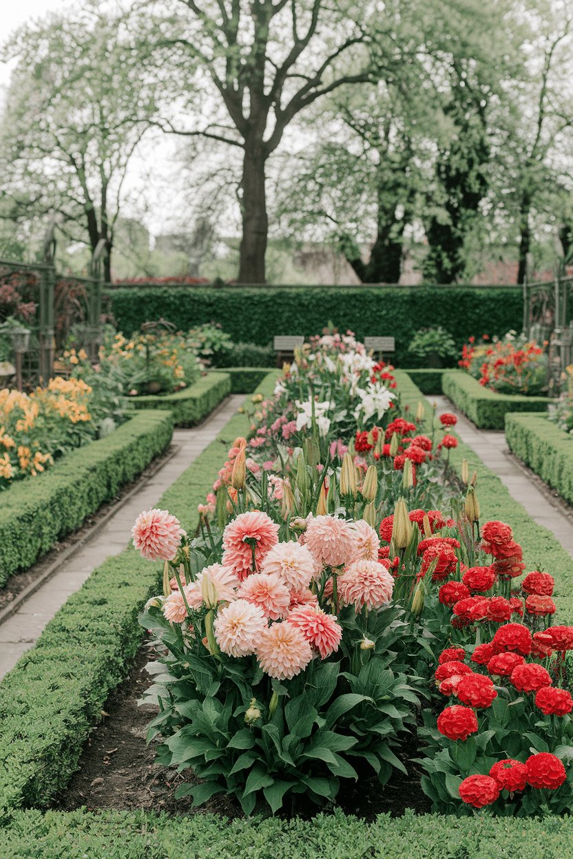 Neatly trimmed hedges frame vibrant flower beds filled with dahlias, lilies, and begonias. This structured approach adds elegance and order. Regular pruning keeps plants looking their best.