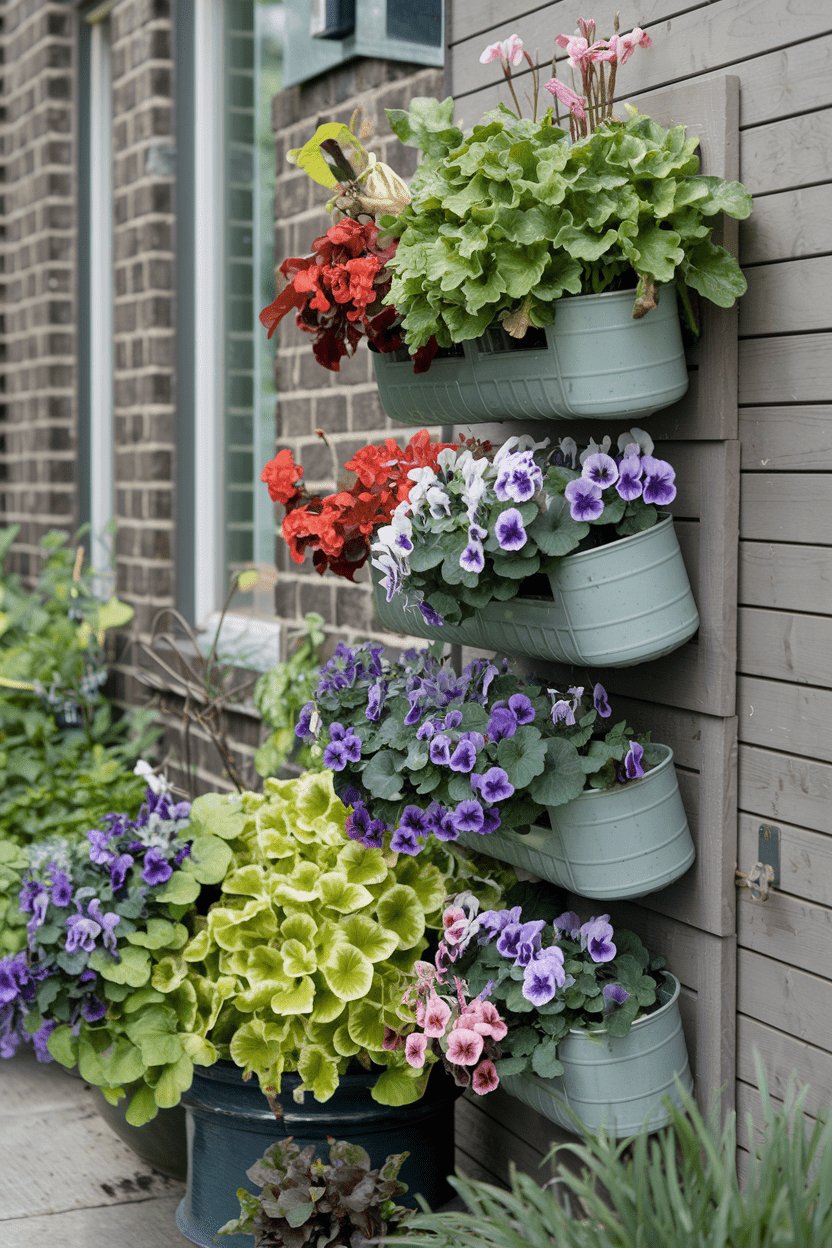 Stack flower pots with violets, begonias, and ferns for a lush vertical garden. Ideal for urban settings, this maximizes space while keeping maintenance minimal.