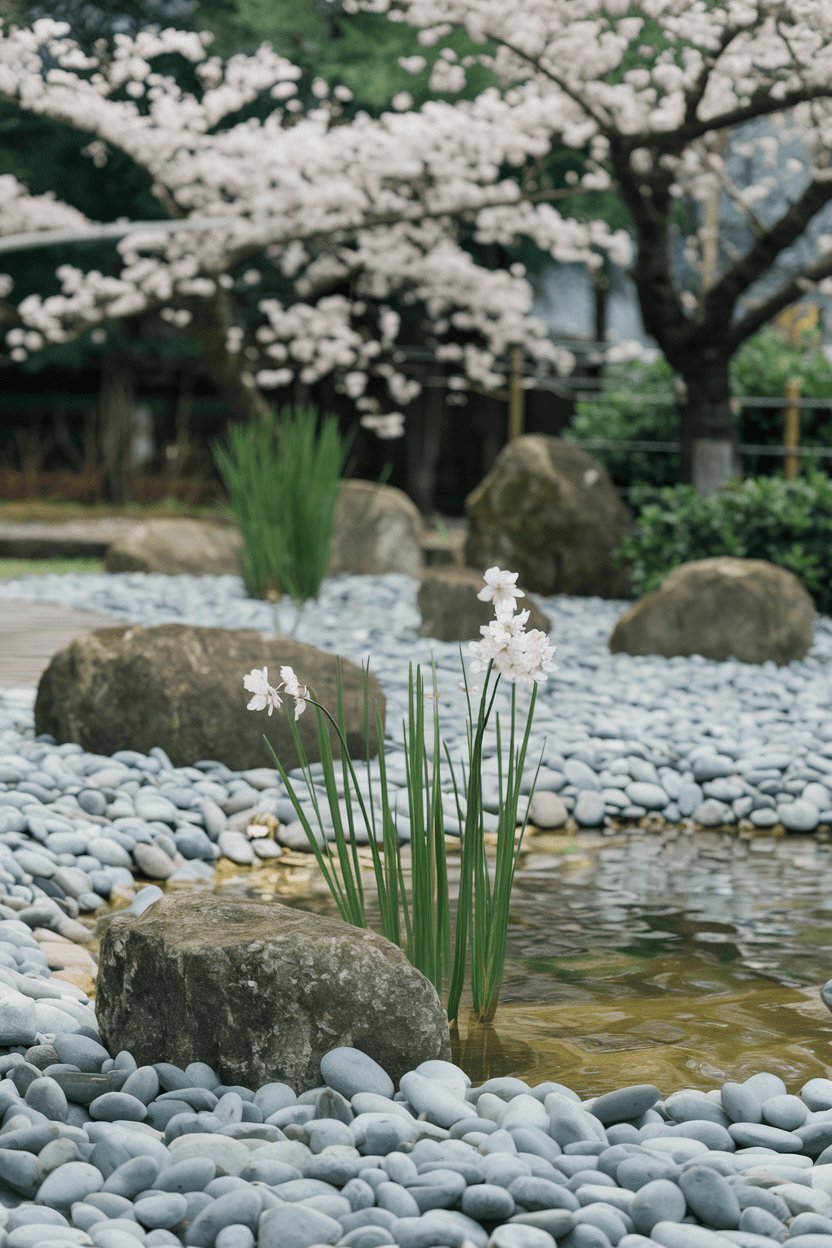 Smooth river stones, cherry blossoms, and a bamboo water feature make for a minimalist spring retreat. Opt for sand or fine gravel to create calming, meditative patterns. Add a wooden bench to invite quiet reflection amidst nature s simplicity.