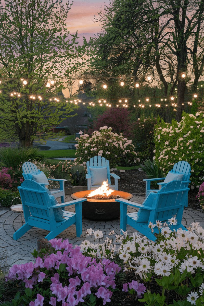 A seating area with a fire pit, azaleas, and daisies makes for a perfect evening garden retreat. String twinkling lights above for a warm glow after sunset. Arrange seating in a circular pattern for an inviting atmosphere.