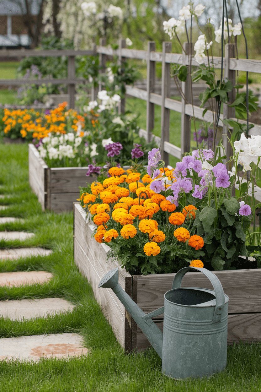 Wooden raised beds filled with marigolds, snapdragons, and sweet peas create a structured yet vibrant garden. Border with rustic stepping stones and a vintage watering can for a classic touch. Use nutrient-rich soil for prolonged blooms.