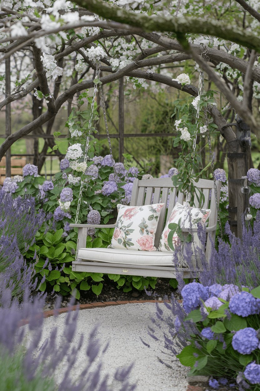 A wooden swing chair nestled among lavender and hydrangeas is the perfect spot for relaxation. Floral cushions enhance comfort, while the lavender s scent promotes calmness. Keep the area shaded for an inviting escape from the midday sun.