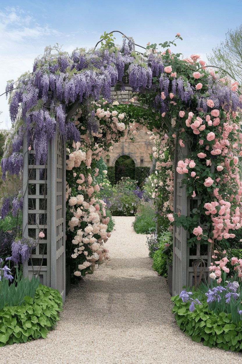 Drape an arched trellis in wisteria and climbing roses to create a stunning garden entrance. These climbers require sturdy support and regular pruning to thrive. Use gravel for pathways to enhance the rustic elegance of your floral gateway.