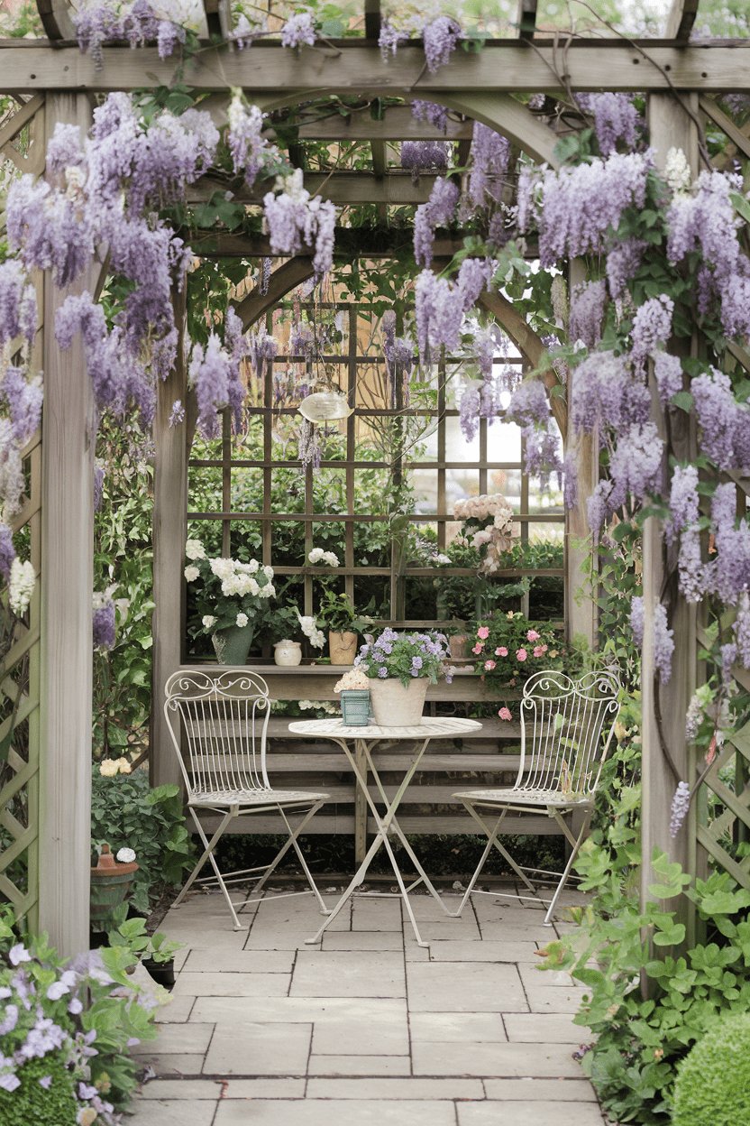 A wooden trellis with wisteria and honeysuckle creates a fragrant escape. Nestle a bistro set beneath for a charming garden retreat. Opt for foldable furniture for easy storage during colder months.