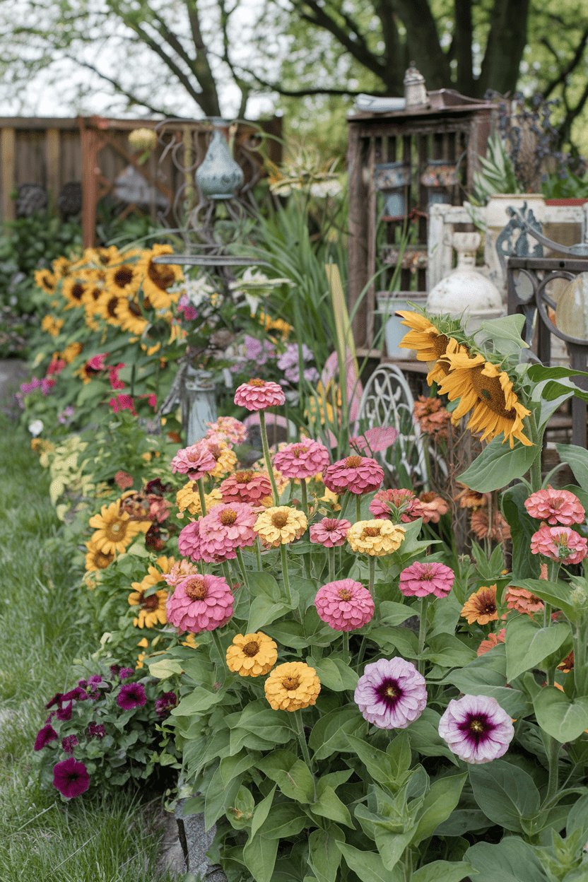Mix zinnias, sunflowers, and petunias with vintage garden decor for a bold, cheerful garden. A repurposed watering can or old wheelbarrow makes an ideal flower container.