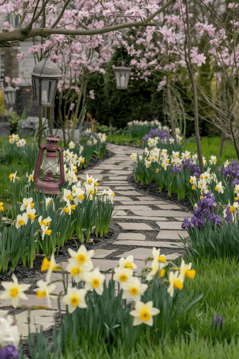A winding stone path through daffodils and irises, with antique lanterns, adds old-world charm. Use solar-powered lanterns for energy efficiency. Opt for perennial bulbs to ensure annual blooms.