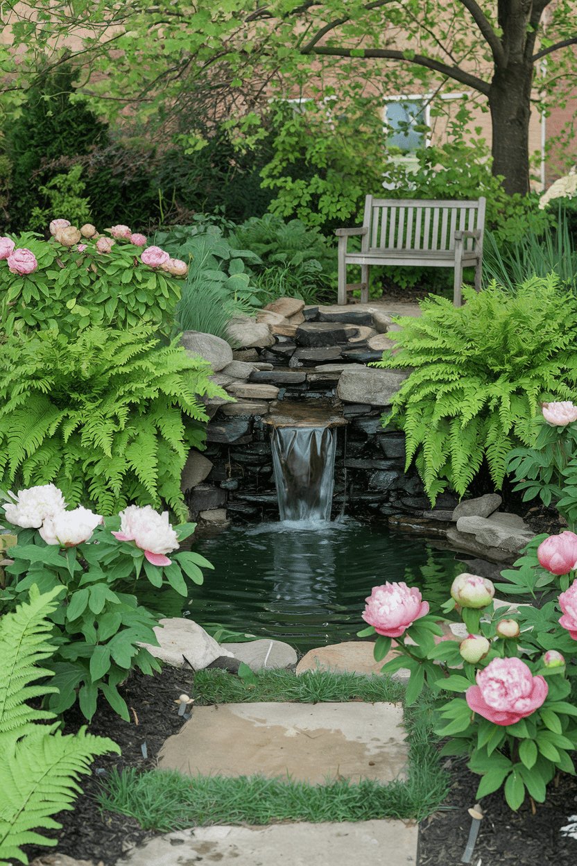 A small cascading waterfall surrounded by lush ferns and peonies creates a peaceful escape. Use stepping stones to lead to a wooden bench for quiet contemplation. Keep water flowing to prevent stagnation and attract birds and dragonflies.