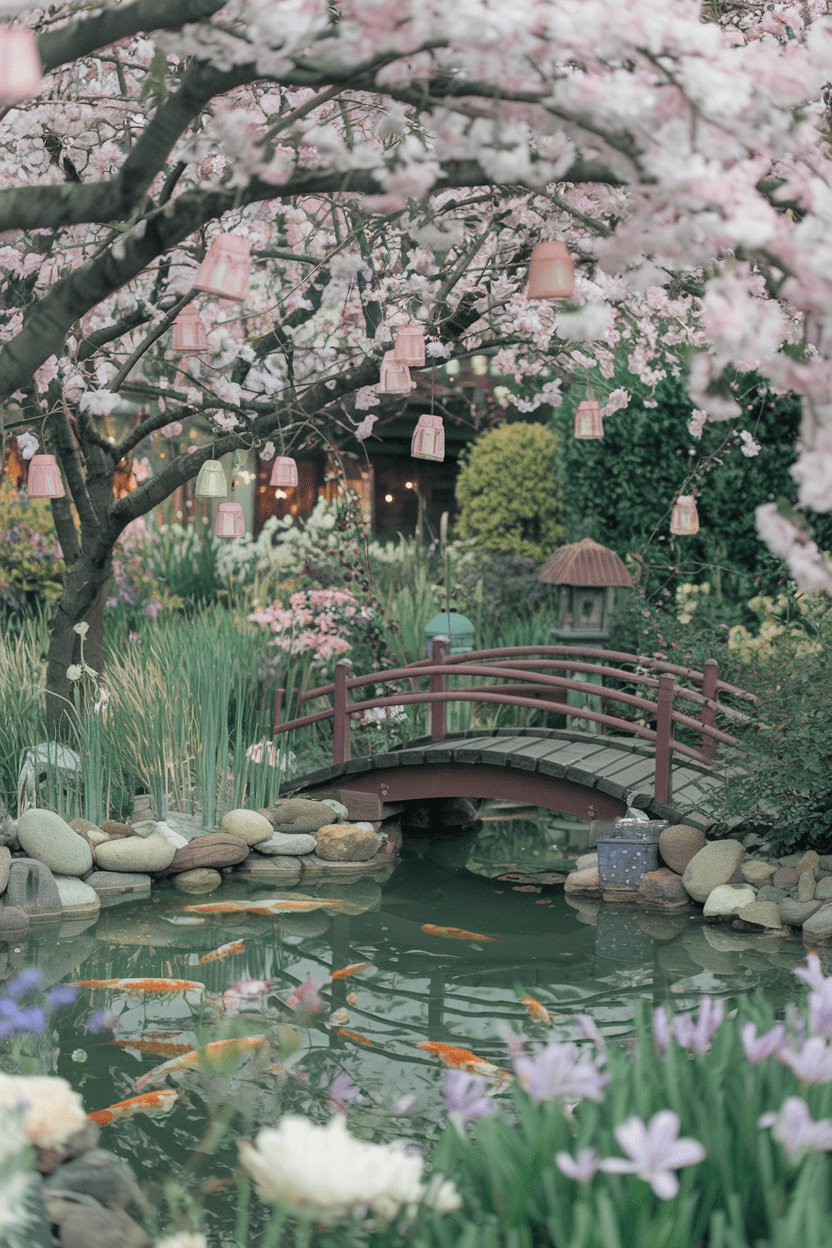 An arched wooden bridge over a koi pond instantly adds charm. Enhance the dreamlike ambiance with pastel-hued flowers and hanging lanterns in trees. Choose waterproof LED lanterns for a soft glow that continues the magic into the evening.