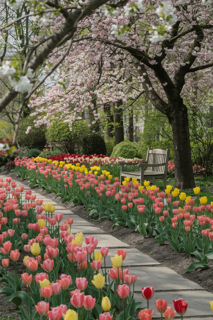 Neatly arranged tulips in vivid reds, pinks, and yellows create a breathtaking sight along a stone pathway. For a truly enchanting effect, mix early and late bloomers to extend the tulip season. Place a rustic wooden bench under a blossoming cherry tree to create a peaceful spot for relaxation and admiration.