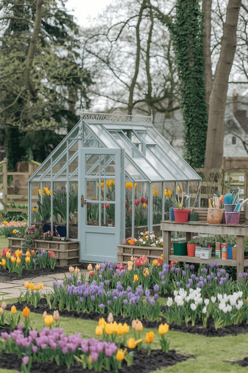A charming greenhouse surrounded by tulips, crocuses, and hyacinths creates an all-season gardening retreat. Keep a wooden potting bench filled with tools and fresh soil for easy access. Ensure proper ventilation to keep plants healthy.