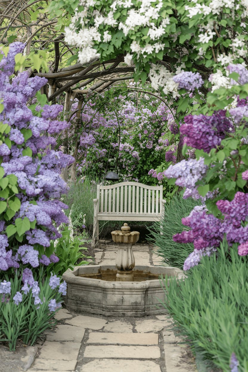 Lilacs, lavender, and jasmine in bloom create a scented paradise. A stone fountain enhances the tranquil ambiance. Keep the area pruned for airflow and fragrance circulation.