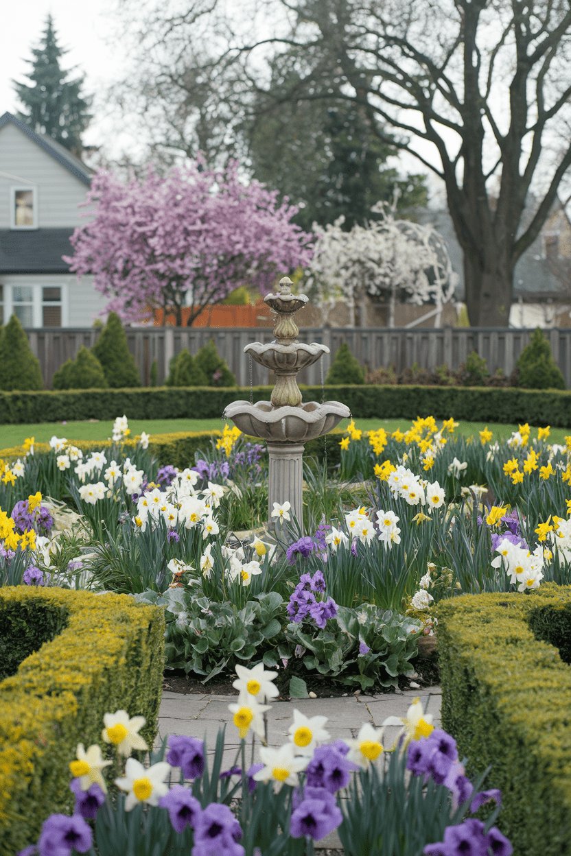 Surround a decorative fountain with daffodils, pansies, and petunias to add movement and life to your garden. These flowers thrive in well-drained soil, so ensure good aeration. Trim hedges neatly around the area to give your garden a well-maintained and sophisticated look.