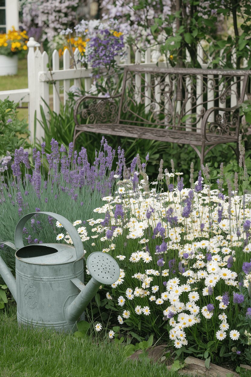 Daisies, lavender, and forget-me-nots spilling over a flower bed bring a cozy, old-fashioned feel. A white picket fence and a vintage iron bench add nostalgic appeal. Keep a weathered watering can nearby for an effortlessly rustic look.