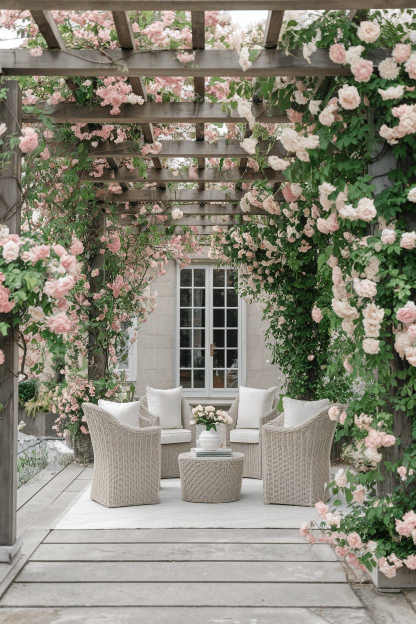 A wooden pergola with cascading jasmine and roses creates a fragrant, shaded retreat. Choose fast-growing climbers to establish coverage quickly. Add a small bistro set for a cozy seating area.