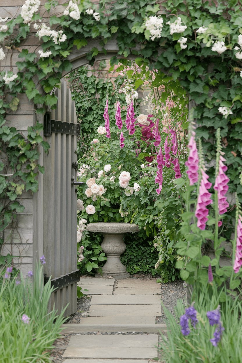 A tucked-away stone bench behind a wooden gate surrounded by climbing ivy and foxgloves offers solitude. This secret garden vibe is perfect for small yards. Use shady plants like ferns to maintain lush greenery.