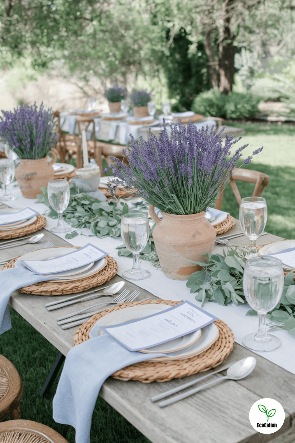 For a rustic Provence-inspired look, set up wooden farm tables with soft linen napkins and rustic pottery. Lavender bouquets bring a natural fragrance and color to the space, creating a charming and peaceful atmosphere for your guests.
