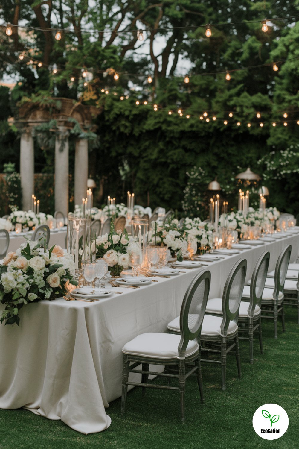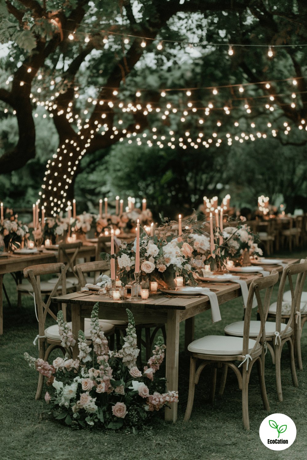 Imagine fairy lights strung between trees, casting a soft glow over rustic wooden tables adorned with candles. Add lush floral centerpieces to complete the look. For a warm and inviting atmosphere, light a few candles in mason jars for an added touch of magic that won t break the bank.