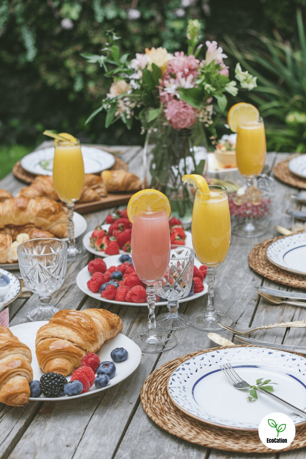 Host a delightful garden brunch with a rustic wooden table filled with croissants, fresh berries, and mimosas in elegant crystal glasses. The cozy, laid-back vibe is perfect for morning or afternoon gatherings with loved ones.