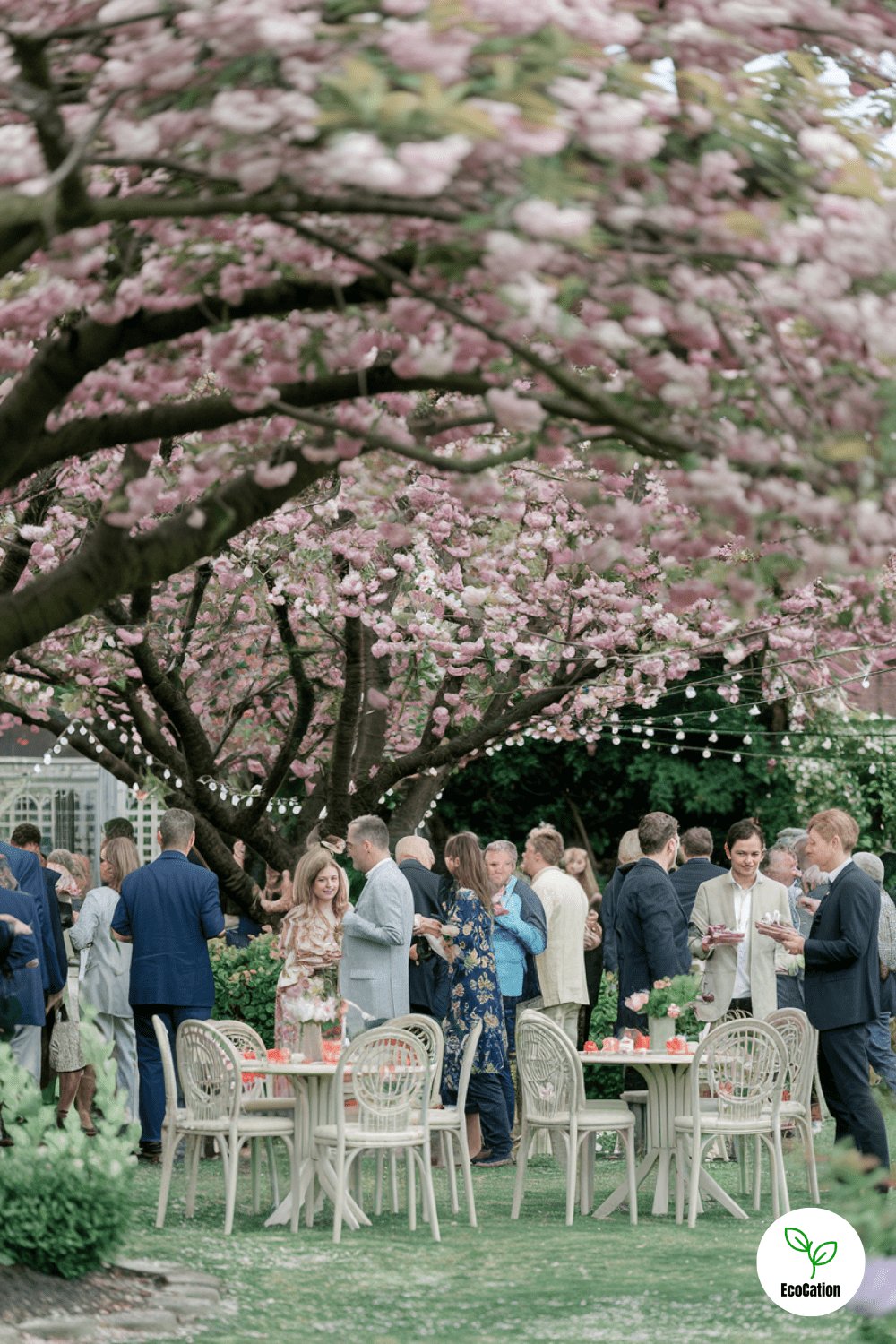 Gather your guests under blooming cherry blossom trees, sipping drinks and enjoying light appetizers. The burst of pink and white flowers creates a dreamy backdrop for your celebration. Consider adding floral garlands to the tables for continuity and added charm.