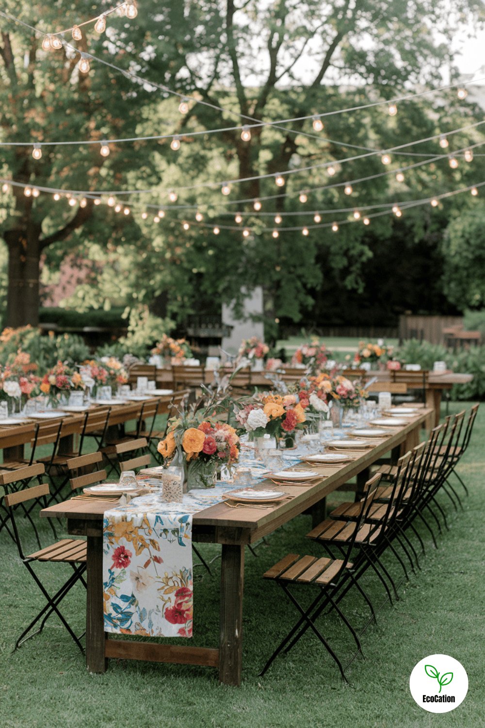 For a charming outdoor design, hang bistro lights crisscrossing above long wooden tables, adorned with vibrant floral table runners. The mix of rustic elements with the twinkling lights creates an inviting and cozy atmosphere for your guests.