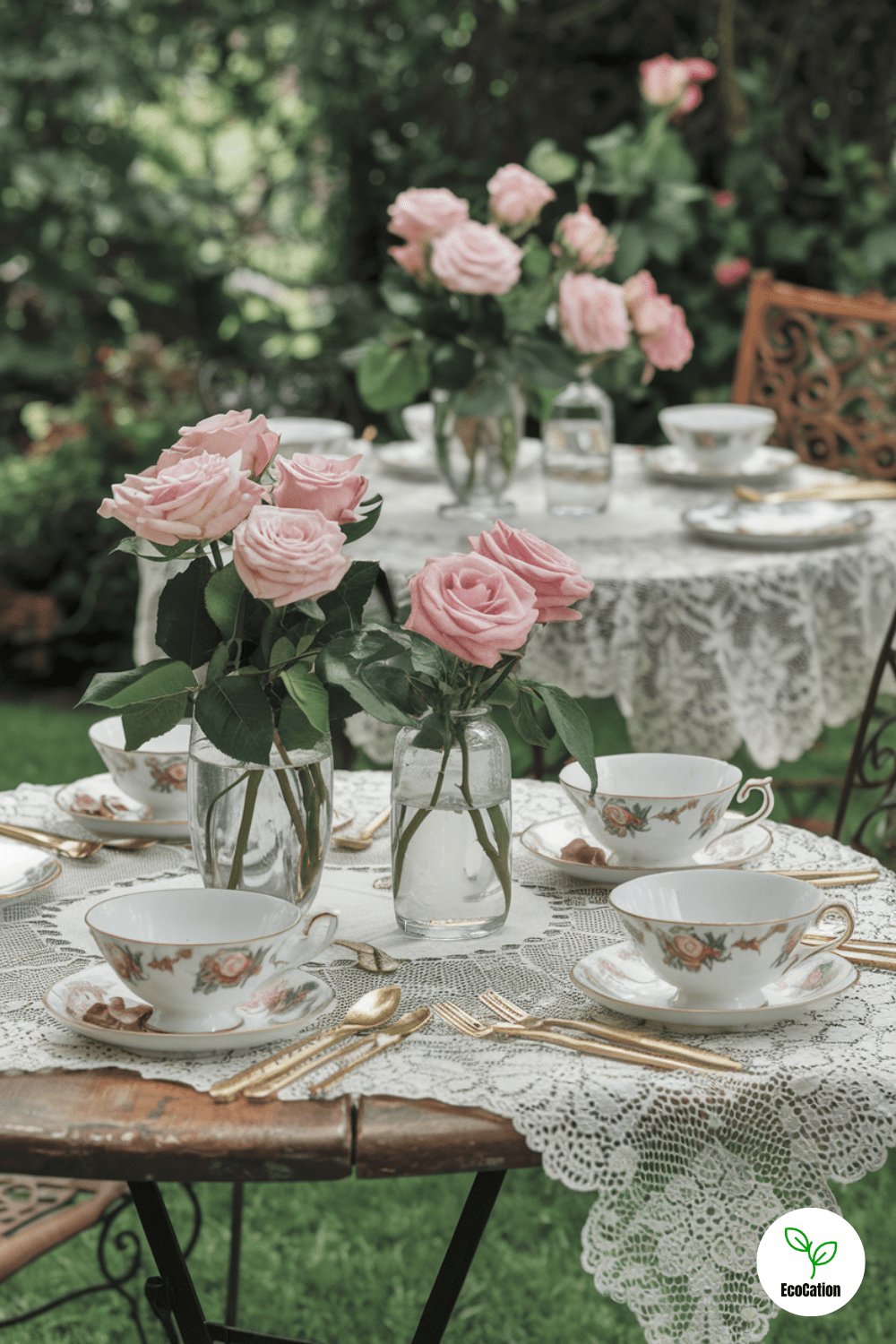 For a charming vintage vibe, use lace tablecloths, fresh roses in glass vases, and classic porcelain teacups on wooden tables. Add a few vintage-inspired chairs and a light dessert spread for a delightful experience. The combination of textures and delicate details will enchant your guests.