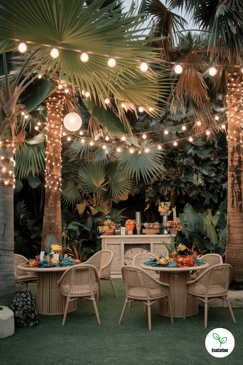 Bring the tropics to your garden with rattan furniture, oversized palm leaves, and a fruit-infused cocktail station under twinkling lights. The vibrant colors and laid-back atmosphere will have your guests feeling like they re on a tropical island. Add a few bamboo serving trays for a beachy touch.