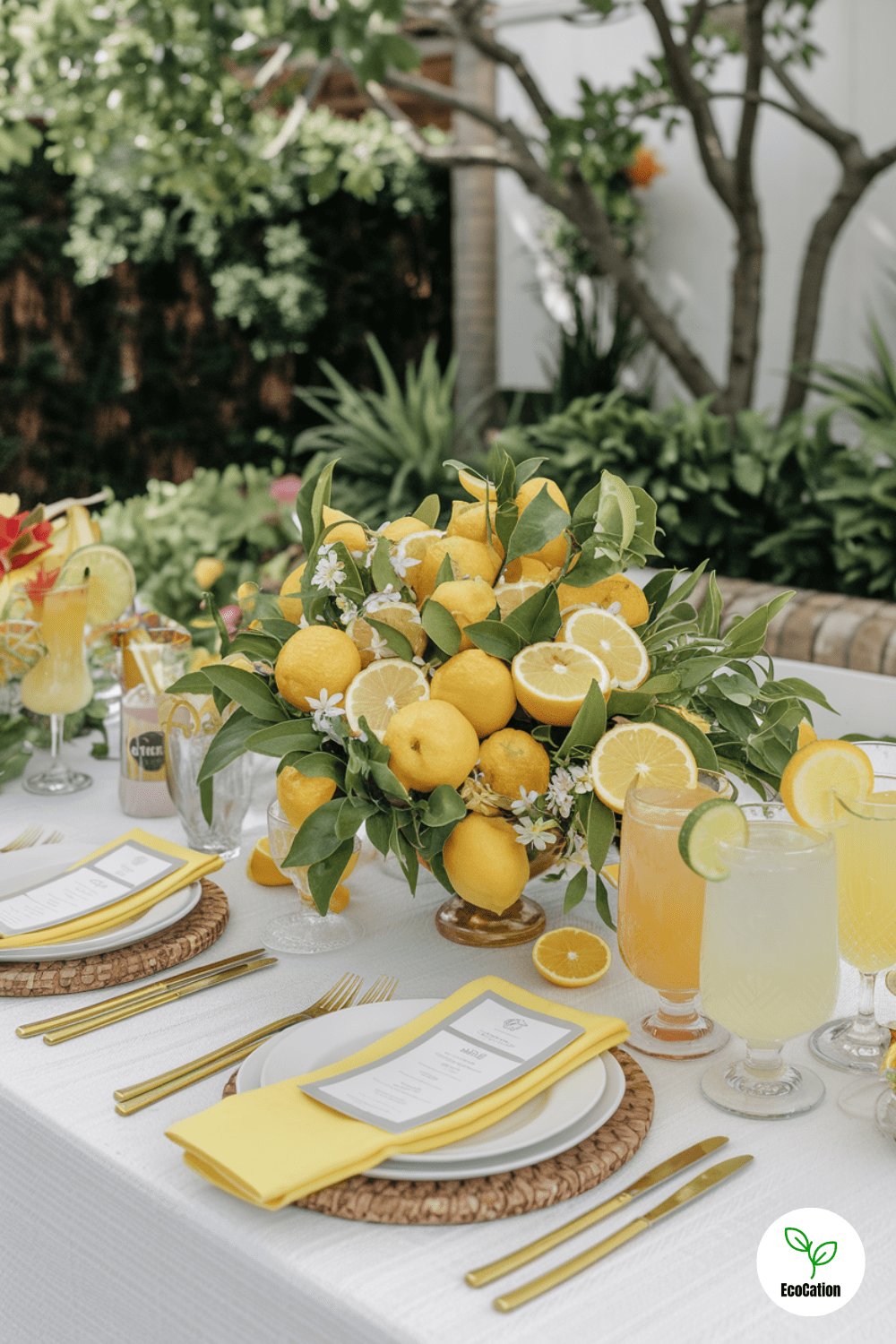 Bring a refreshing summer vibe to your garden party with lemon and orange centerpieces and bright yellow napkins. Set up a drink station with citrus-infused cocktails for a fun and flavorful twist that will brighten up your celebration.
