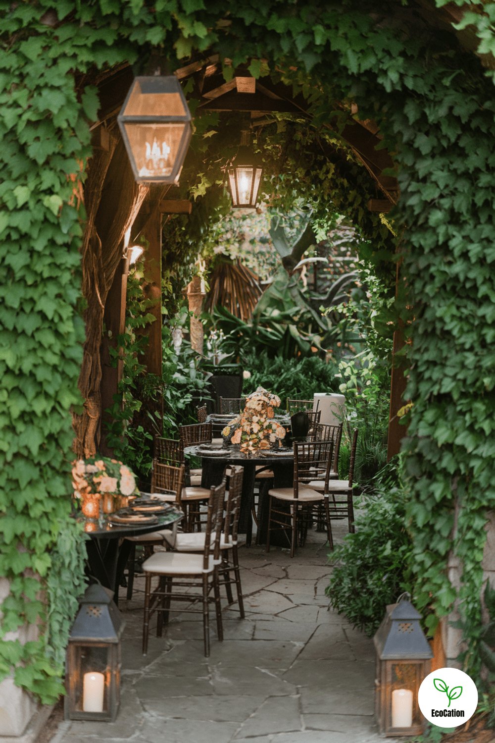 Design an enchanting secret garden with hidden seating areas, lantern-lit pathways, and ivy-covered tables. The secluded, magical atmosphere will surprise and delight guests. Incorporate natural elements like moss-covered stone or wooden benches for a truly rustic feel.