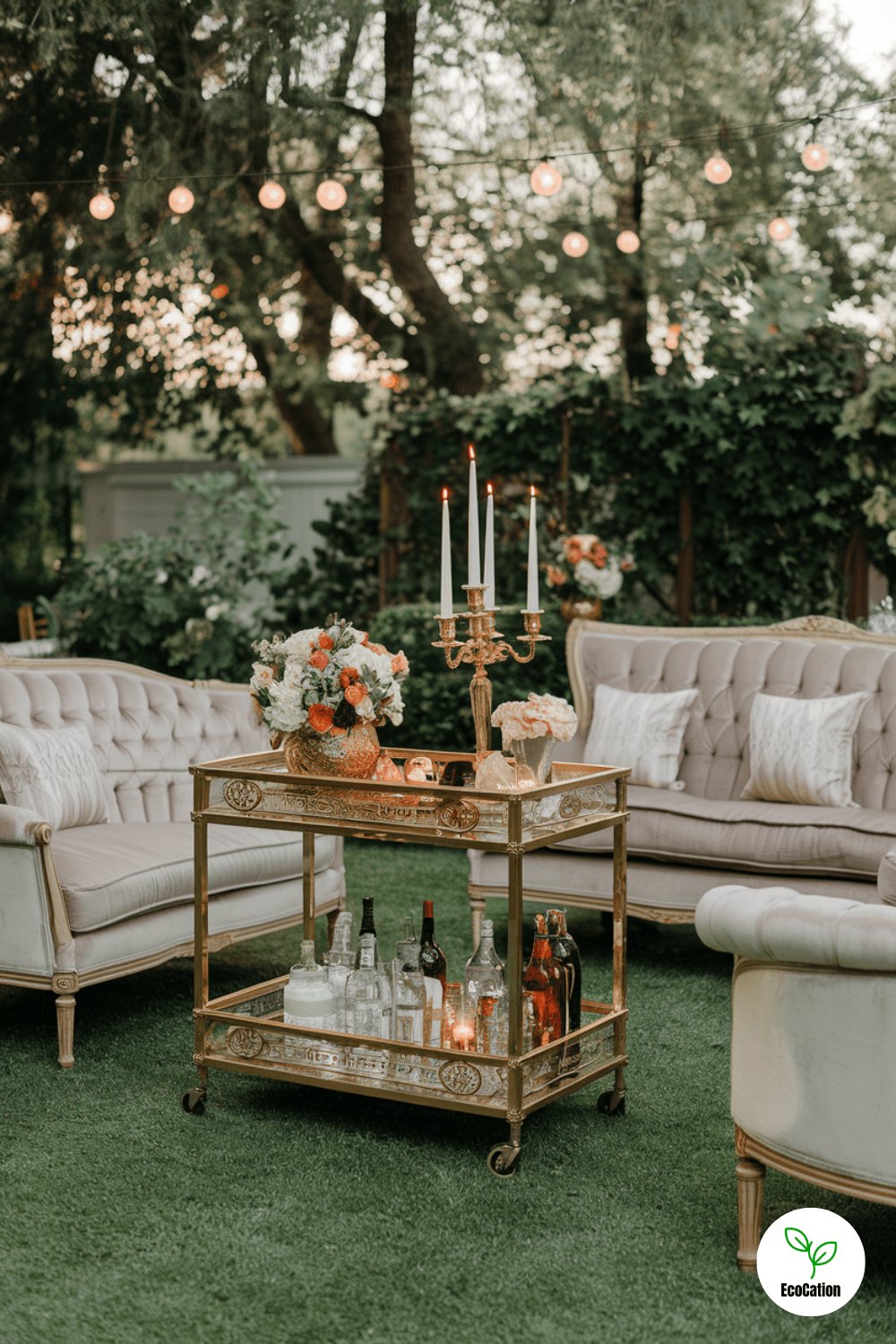 Create a stylish garden setup featuring plush outdoor sofas, golden candle holders, and an elegant bar cart filled with artisanal cocktails. The sophisticated setting is perfect for mingling and enjoying a delightful selection of drinks in style.