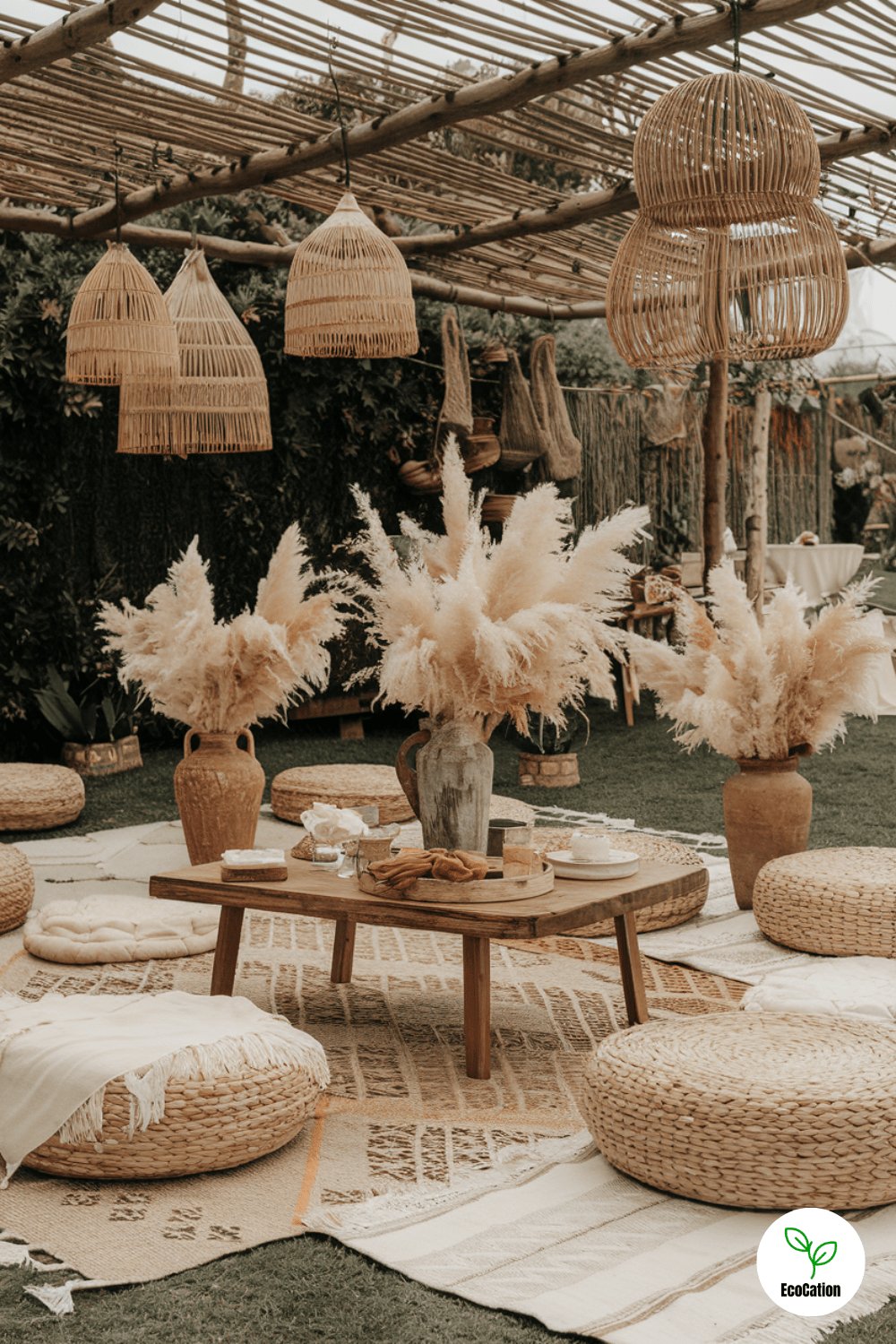 For a stylish boho-inspired party, set up woven rugs, low wooden tables, and colorful floor cushions. Pampas grass arrangements in rustic vases will bring the natural beauty of the outdoors into your design. Add some twinkling lights to complete the laid-back yet trendy vibe.