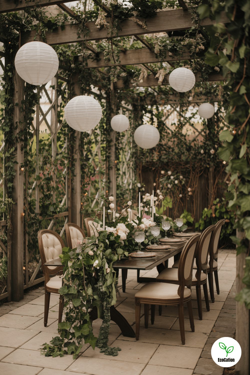 Set the mood with hanging lanterns, ivy-wrapped trellises, and an intimate dining table covered in lush floral garlands. The twinkling lanterns will create a cozy atmosphere, perfect for evening parties. Place lanterns along pathways for an enchanting touch.