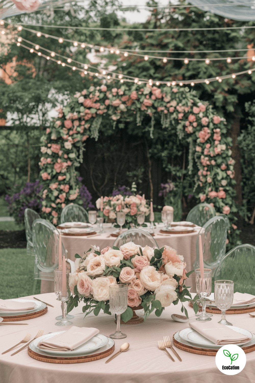 Design an intimate garden setup with a stunning floral arch, delicate string lights, and peony and rose bouquets on the tables. This creates a lush, romantic atmosphere. To make it extra special, consider adding soft, sheer fabrics that sway gently in the breeze, enhancing the charm of the garden.