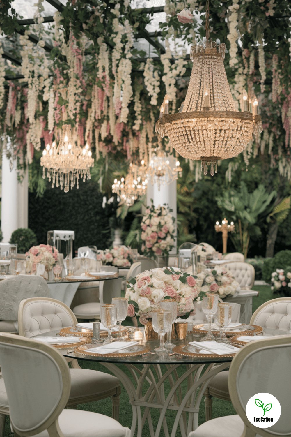 Elevate your garden party with hanging crystal chandeliers, gold-accented tableware, and plush seating under a canopy of flowers. This luxurious design idea transforms any garden into an opulent setting, making your celebration feel extra special. A string of fairy lights will add that extra touch of glamour.