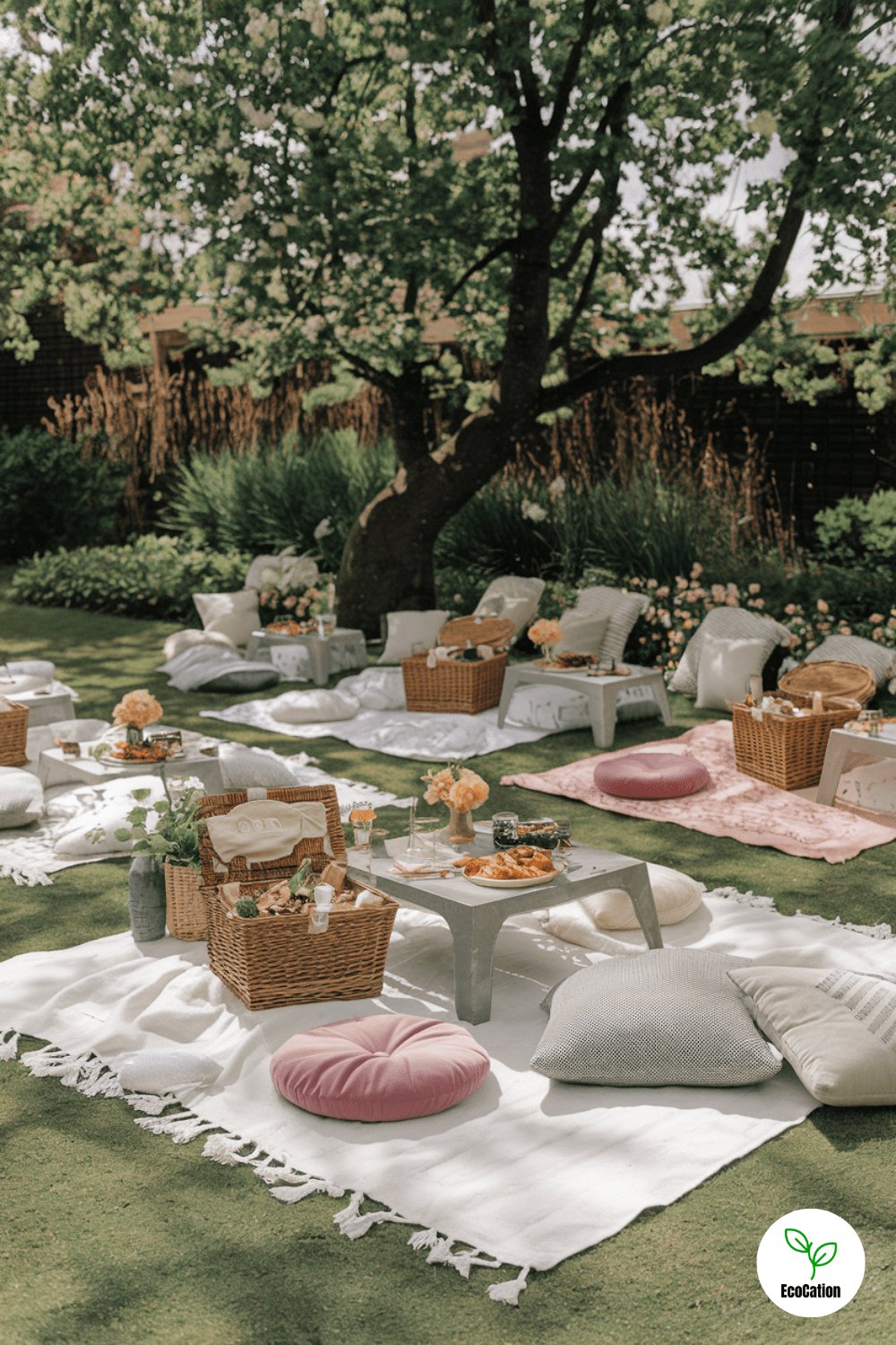 For a relaxed feel, lay out picnic blankets with wicker baskets filled with gourmet snacks. Low tables surrounded by plush cushions make for a comfortable gathering. Include a refreshing drink station with sparkling water and citrus fruits for an easy and fun setup.