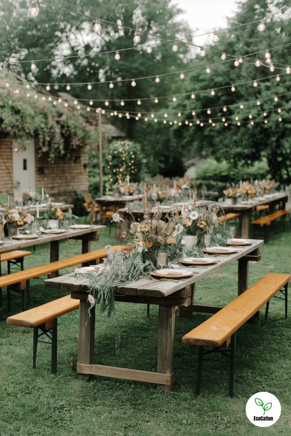 Create a picturesque garden party with raw wooden tables, wildflower centerpieces, and twinkling string lights overhead. Wildflowers add a carefree and vibrant touch to your decor. Make sure to arrange flowers in varying heights for a natural, organic look that feels fresh and inviting.