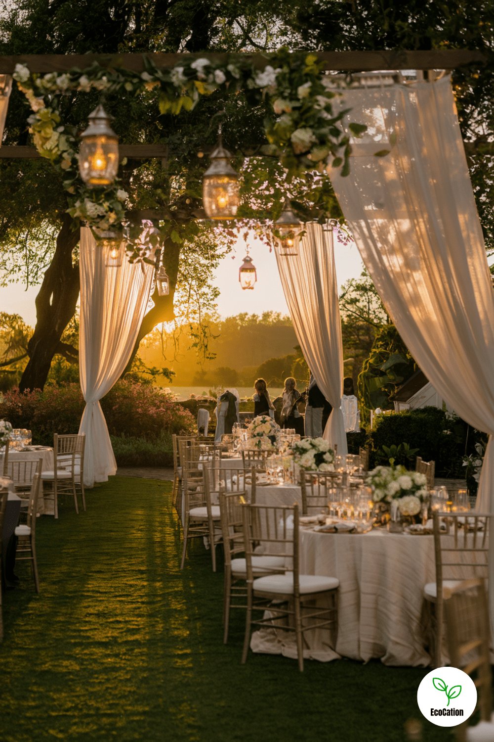 Set up a breathtaking garden party under a golden sunset, with lanterns flickering and soft drapes swaying in the evening breeze. Guests will feel the magic of the moment. Opt for elegant tableware and serve fine wine for a relaxed yet sophisticated outdoor celebration.