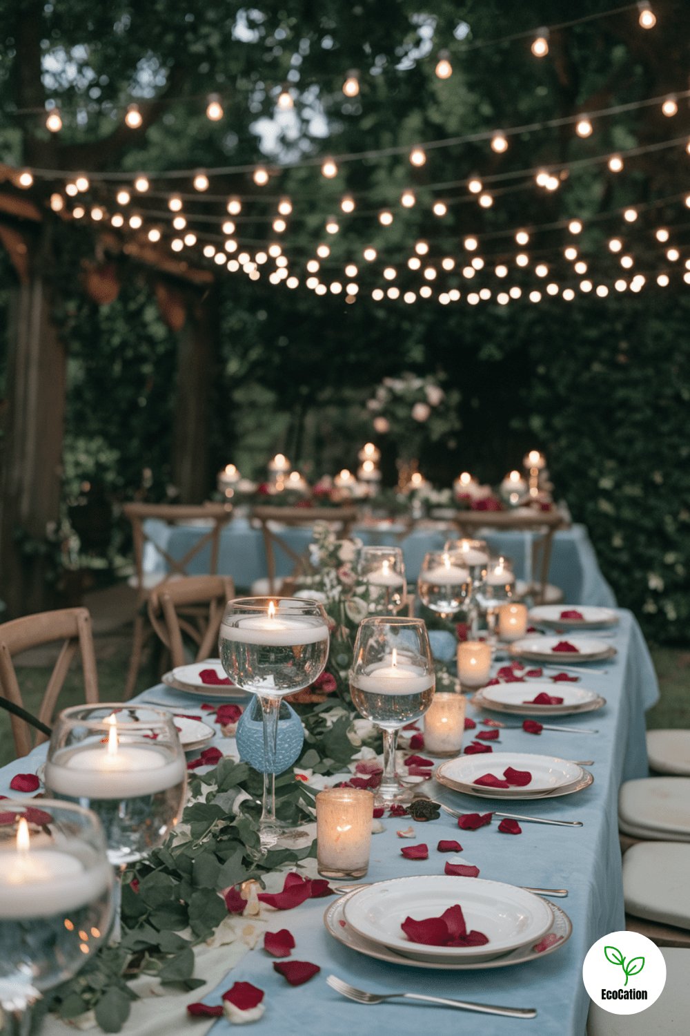 Create a fairytale-inspired garden party with floating candles in glass bowls, rose petals scattered across the tables, and twinkling fairy lights overhead. This dreamy setting will transport guests into a magical world of enchantment, making it the perfect way to end an unforgettable celebration.