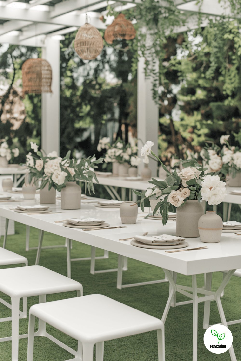 Create a sleek, modern garden party with white tables, minimalist decor, and neutral-toned floral arrangements. Ceramic vases add a contemporary touch, while adding a few statement pieces like geometric centerpieces ensures a stylish and sophisticated vibe.