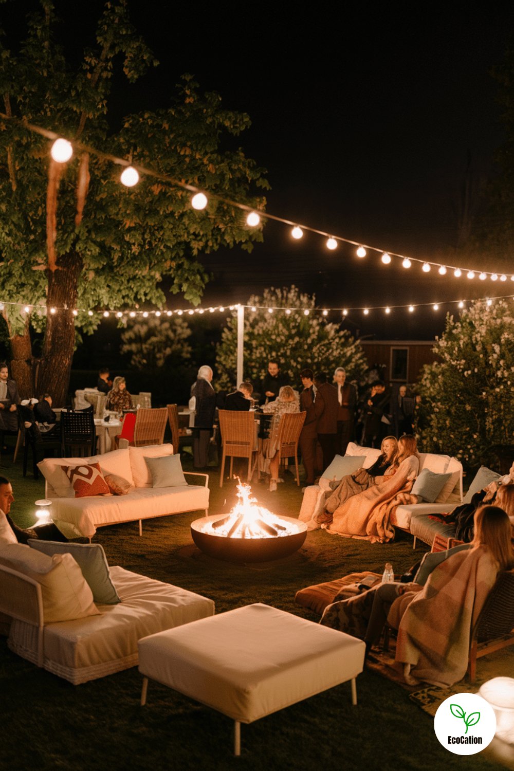 Set up comfortable lounge seating around a glowing fire pit, where guests can enjoy the warmth while wrapped in soft blankets. Add rustic touches with lanterns or candles on nearby tables to enhance the cozy, inviting atmosphere. This setup is perfect for a night-time garden celebration.