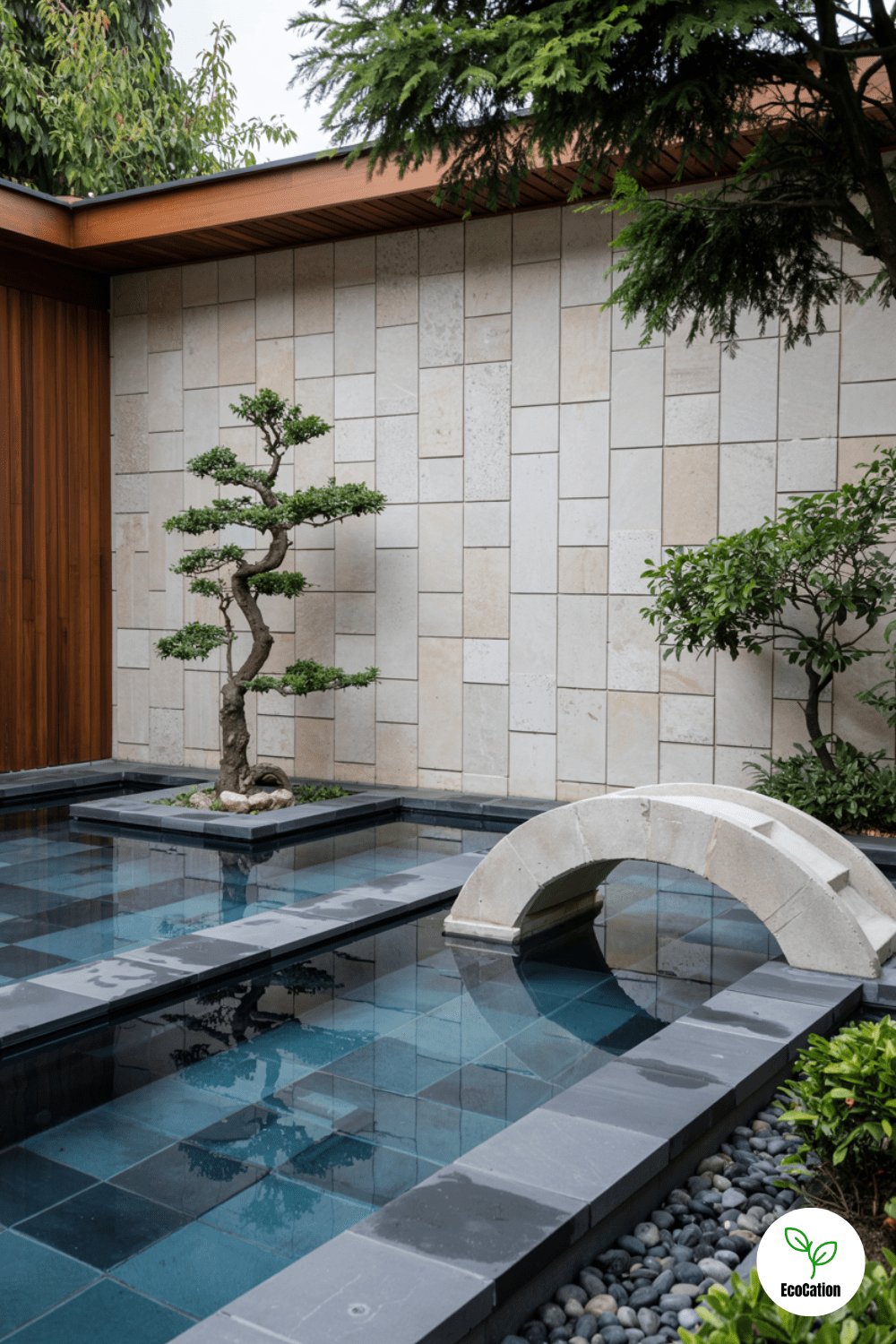 Dark slate tiles, bonsai trees, and a minimalist stone bridge create a zen-inspired retreat. The dark water reflects the surroundings, enhancing tranquility. Add a small bamboo fountain for gentle sounds, and keep decor simple to maintain the serene atmosphere.