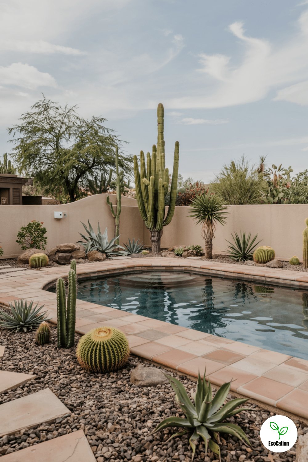 Gravel, succulents, and tall cacti border this terra cotta-tiled pool deck, blending seamlessly into a desert landscape. Use heat-resistant materials, and incorporate a shaded lounging area to escape the midday sun. Drought-tolerant plants keep maintenance low.
