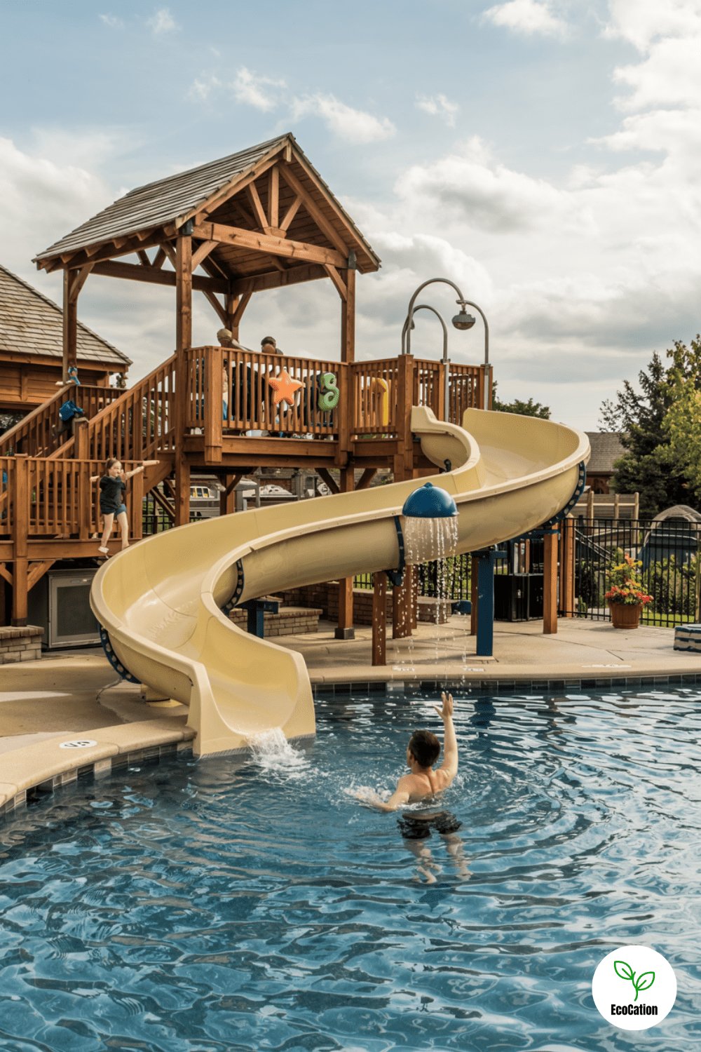 A curved waterslide, splash zone, and poolside play area make this pool a hit with kids and adults. Use non-slip decking for safety, and consider a shallow end for little ones. Add a shaded pergola so parents can relax while keeping an eye on the fun.