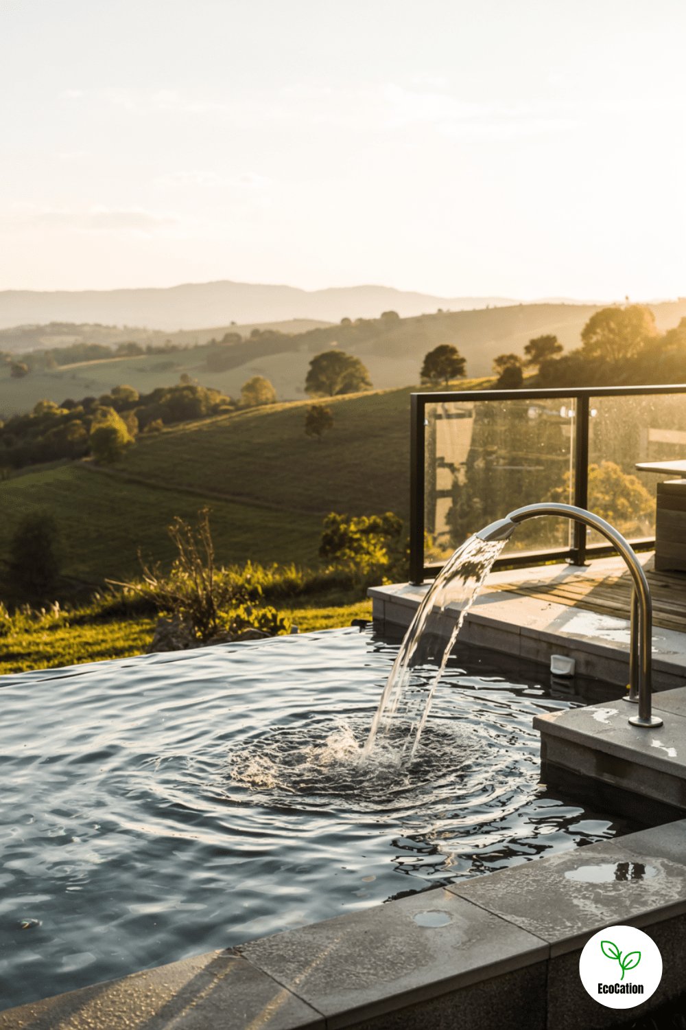 An infinity-edge pool overlooking rolling hills creates a breathtaking view, especially at golden hour. The glass railing keeps sightlines open, while built-in spa jets add relaxation. Position seating to face the horizon for the ultimate sunset experience. Pro tip: Use darker tiles to enhance the illusion of endless water.