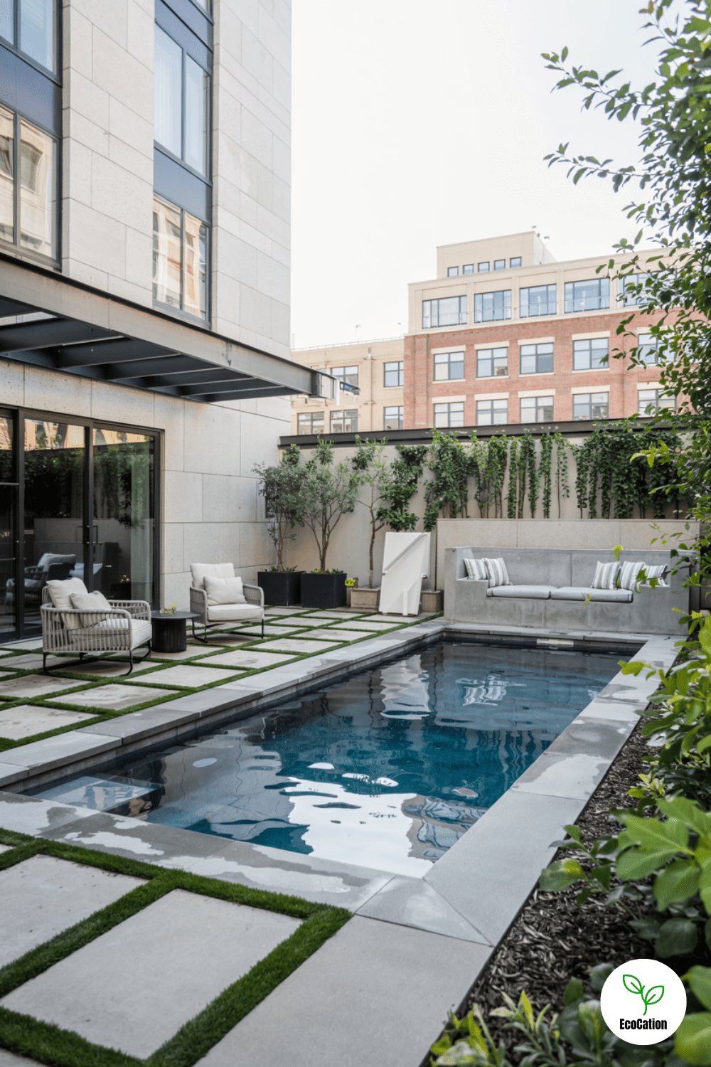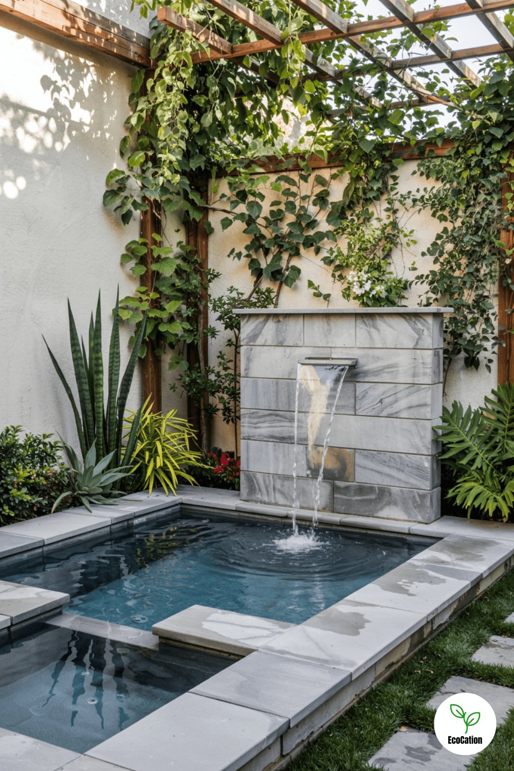 Perfect for narrow backyards, this geometric pool features cascading wall fountains and vertical garden walls. The sharp angles maximize space, while the fountain adds soothing sounds. Opt for drought-resistant plants in the vertical gardens to keep maintenance easy.