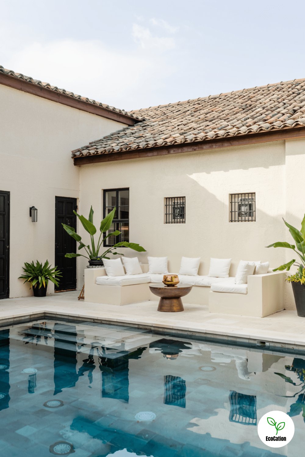 Shimmering glass mosaic tiles cover this elegant pool, catching the sunlight beautifully. Surround it with minimalist furniture and tall planters for a chic look. Choose iridescent tiles for extra sparkle in the daylight.
