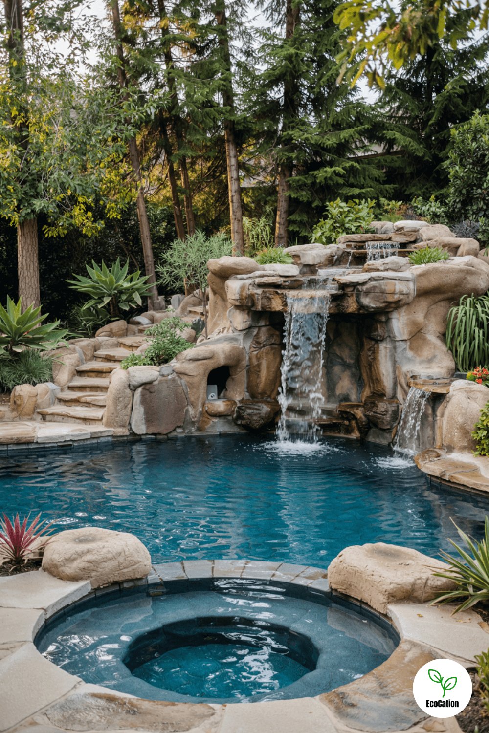 Rock formations, waterfalls, and hidden grottos make this pool feel like a secluded lagoon. The organic shapes blend into the landscape, creating a serene escape. Add tropical plants and boulders for a truly immersive experience.
