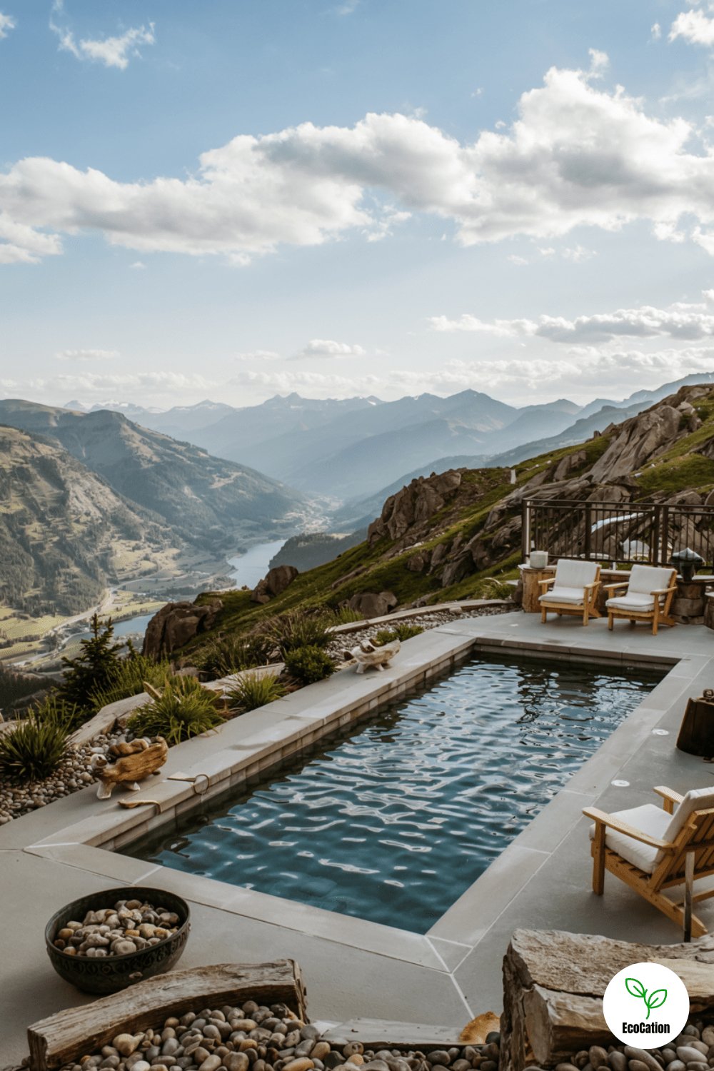 Perched on a slope, this pool offers panoramic views with rugged stone edging. Alpine-inspired decor, like wooden Adirondack chairs, completes the rustic-luxe vibe. A heated pool extends the swimming season in cooler climates.